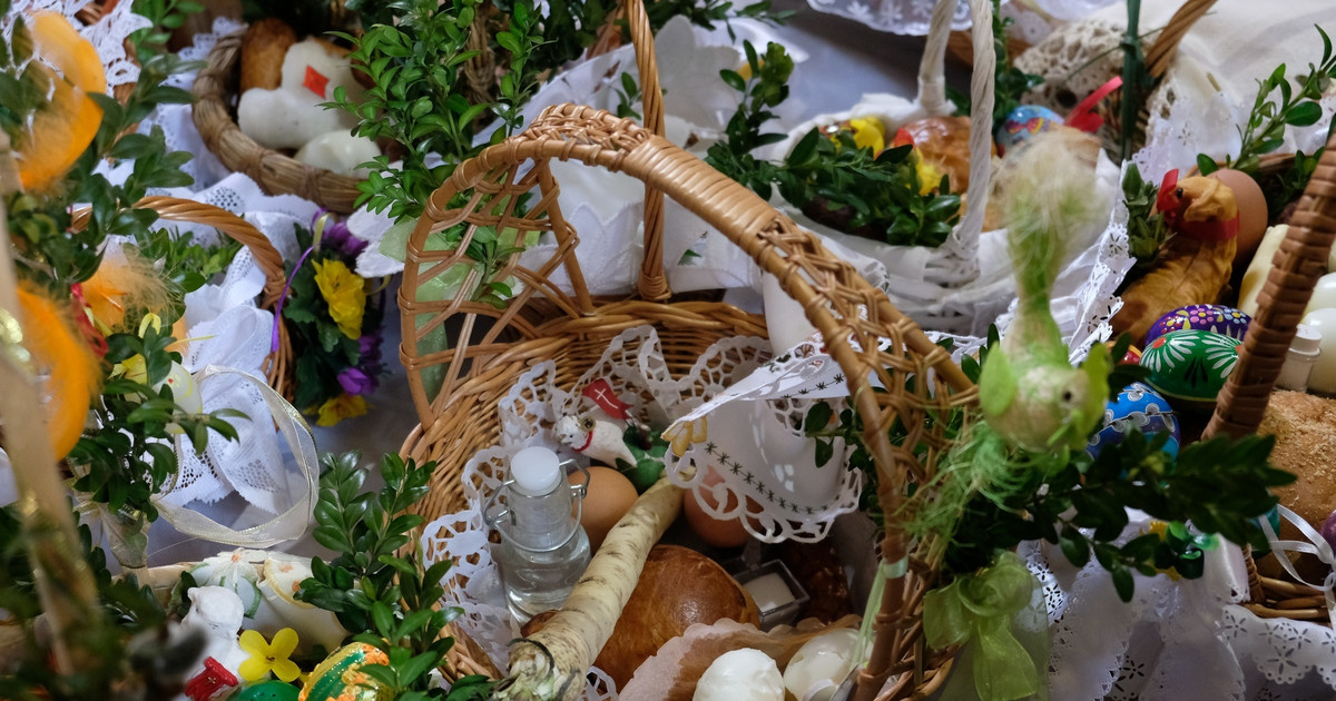 Zgodnie z polską tradycją w Wielką Sobotę udajemy się do kościoła z wiklinowymi koszykami w rękach, by poświęcić pokarmy na świąteczny stół. Zwyczaj ten sięga VIII w., natomiast w Polsce znany jest od XIV w. Kiedyś szlachcic posyłał powóz konny po kapłana, którym dobrodziej przybywał do dworu, by poświęcić cały stół. Obecnie obrzęd święcenia potraw odbywa się najczęściej w kościołach albo przed nimi, na wystawionych stołach. Do koszyka wkładano zawsze pokarmy, które w pierwszy dzień świąt podawane były „bez dymu”, bo przygotowywano je wcześniej i nie wymagały gotowania. W Wielkanoc nie rozpalano bowiem ognia pod kuchnią.